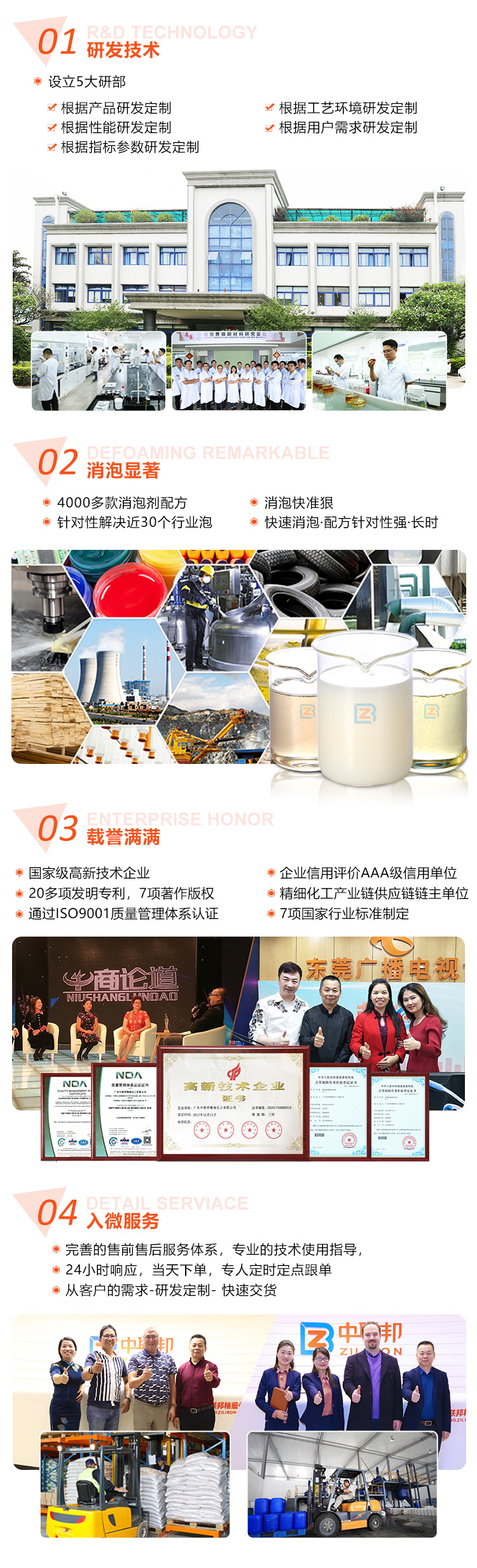 多年來公司面向市場,面向真實各行業客戶現場,對水處理消泡劑、工業消泡劑、有機硅消泡劑、發酵行業、清洗劑行業、金屬加工行業、造紙行業、建材行業、水性粘合劑行業、紡織印染行業、油田行業、水性涂料行業、印刷材料行業、電廠脫硫行業、工業清洗行業、家用化學品行業、采礦選礦工行業等32個行業工藝、流程及產品配方深入了解,對各行業消泡劑應用了如指掌,給能客戶提供合適的解決方案,所研發生產消泡劑適應客戶需求和市場需要,能輕松解決客戶遇到的難以解決的消泡難題,減少了客戶使用消泡劑的成本。公司依托完善的售前、售中及售后服務,全程技術跟進消泡劑的試樣到使用過程,節省了時間和成本,贏得了業界各類客戶們的贊譽!
